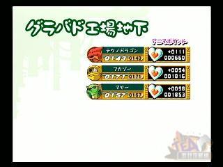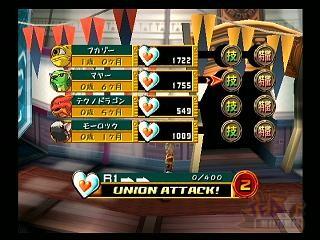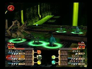 本作的遇敌是可见式的,在没被敌人发现接近它进入战斗后会获得极大的先手优势。战斗的方式是半即时式的,敌我双方的行动(移动不消耗)都要消耗消耗各自的Guts值,战斗中Guts会不断回复。当怪物站成一排时脚下会出现绿圈,这时就可以发动连携攻击了和合体攻击了(Guts在55以上才可以合体攻击,消耗所有的Guts)。左上角的数字代表还可以发动合体攻击的次数。发动合体攻击后进入类似拼剑模式,疯狂按键吧。敌我靠在一起的时脚下的会出现红色的圆圈,这时敌我都不能移动,可以进行近身攻击,连续按方块键能把对方弹开。