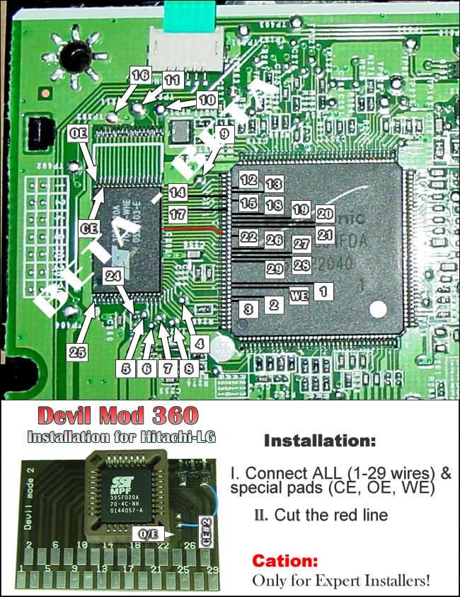 Devil Mod 360破解芯片上装载了一个开关,让玩家可以选择是否启动破解芯片玩备份光盘或是正常启动连入Xbox Live。如之前消息所言,XBOX360的光驱固件是一个突破点,所以这次的破解芯片是装载在光驱底板上,并非以往的主机主板上。破解芯片上也搭载了一个固件芯片,可以通过破解组织发布的升级包对其更新,实现更完善的功能。