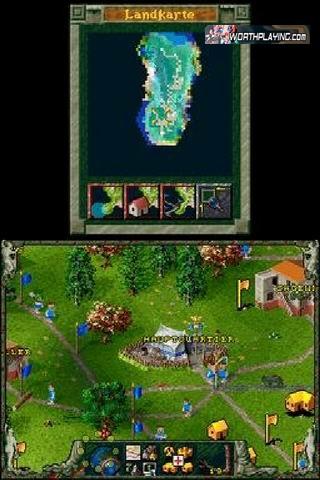 你无需直接控制你的单位,你需要的是为你的子民们创造尽可能好的生存条件,比如建造建筑,在居住区之间建路等等。NDS的上方屏幕会显示你的世界,触控屏幕用于管理你的子民们。