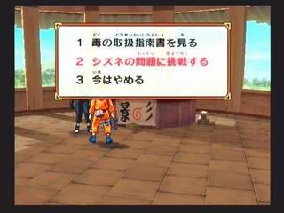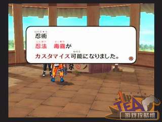 先去找日向雏田,在地图左下的绿色点标示,说完话后可以自行在村里里面转转,也可以直接选择大地图移动去演习场,推荐去火影那里找到静音,跟他对话,静音说有本关于“毒的忍术书”找不到了,让鸣人帮忙去找,出来后,不远就在地上看到一个闪光的东西,调查拣起来给静音,之后对话选择第二项,答对3道问题可以学会“忍法 毒雾” 问题的答案分别是:“1:忍花乌兜 2:根 3:“忍法 毒雾” 之后学会 “忍法 毒雾” 可在状态栏里面自行调整忍术。之后地图上出现橙色标示, 是卷轴,可以过去拿。