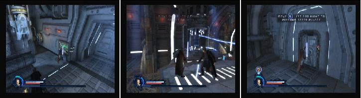消灭一定敌人,出现新路。机器人过来后,开始破解,破解时把过来的敌人消灭。破解完成后桥被打开。走到尽头,在图上处(FORCE的光阵上),按住R1,障碍物消失,出现新路。过桥,动画,在洞下消灭敌人,按○键打开开关,站在FORCE的光阵上,按住×键,蓄力跳跃。上来后再从FORCE的光阵上,用蓄力跳跃跳上高层平台,消灭敌人后跳下。开始破解,完成后进入。