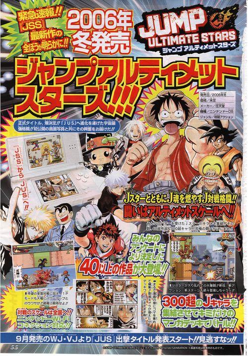 去年在NDS上曾经推出过一款梦幻格斗游戏,是由任天堂与日本漫画出版商集英社合作开发,以在日本超受欢迎的漫画周刊《少年JUMP》上历年来连载的超人气漫画为题材的格斗游戏《JUMP全明星大乱斗》(Jump Super Stars),当时消息一出就感动了众多的漫画爱好者,而游戏在实际发售后,又以优秀的素质感动了一批游戏玩家!
