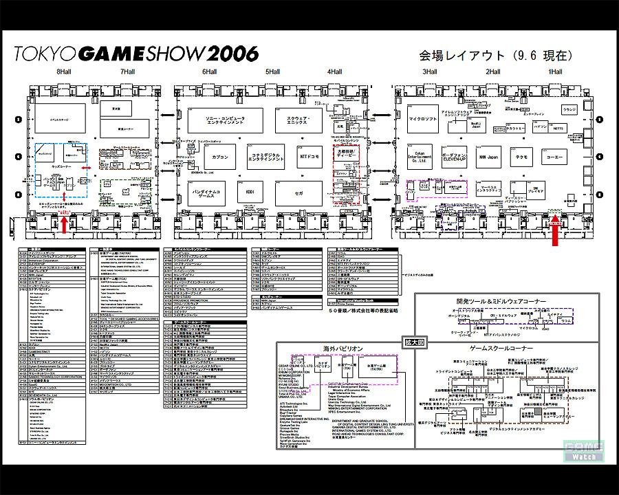 CESA发表了预定于9月22日至9月24日召开的“东京电玩展2006”的展会分布图,并公开了东京电玩展十周年纪念企划的具体内容。本届展会所使用的展厅由去年的7个增加至8个,1至6号展厅为一般厂商的展区,其中在4号展厅设置手机展区、2号展厅设置开发工具&中间设备展示区、1号展厅则设