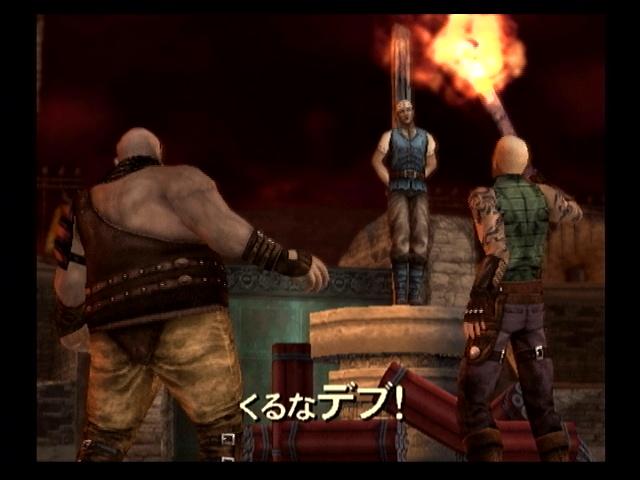 刚来到这里就看到一个被困在炸药堆上的平民,一群恶棍正在点火,主角自然不会坐视不管,立刻冲向旁边的油桶,抱起来,扔出去,死一个敌人了,虽好先干掉拿火把的,然后迅速捡起火把继续无赖的△攻击憋屈死其他人,当火把用完的时候再去杀一个拿火把的敌人继续△攻击……最后的那个胖子攻击力比较高,最好和他近身牵制,距离远了反而不利,如果用火把△攻击的话就能生生憋屈死他,在消灭的人的同时要注意熄灭炸药的导火索,不然那个平民就升天了,方法是跑到火星处按○即可,好不容易将敌人都消灭了结果发现那小子原来根本没有被捆住,倒是自己跳了下来用十分猥琐的方式跑了…………之后打开台子上的箱子,学会新的GOD REEL,取得门前的钥匙后进入大门,在高台出的右边可以在小精灵处挑战任务——2分钟内达到全部敌人,难度比较适中,可以重复挑战,在两边的箱子堆中补充完毕后冲上桥一个飞踢撂倒敌人后开始“灭火”消灭这里的三个敌人后进入大门来到下一个场景