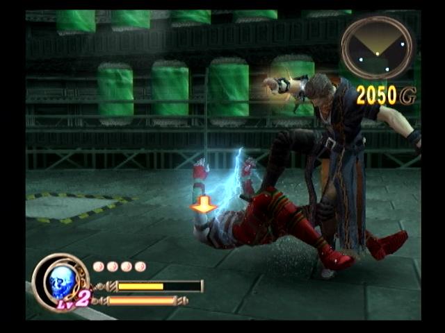 先将这里的三名敌人分别引出来解决后,开启机关打开旁边的门后飞上平台,注意平台上的机器,不要站在它下面,否则不好玩,将机器分别打碎后开启后面的电源,每开起一个会出现三个敌人,将三个电源全部开启以后进入旁边的小门,在这里可以可以向小精灵挑战任务——2分钟内破坏掉汽车,不过这次明显是高级车,因为旁边多了好多保安,不过正好能抢他们手中的武器用△攻击迅速报废汽车。之后下来看掉两个看门即可进入下一个场景,走之前记得把这里的箱子里的东西都敛走