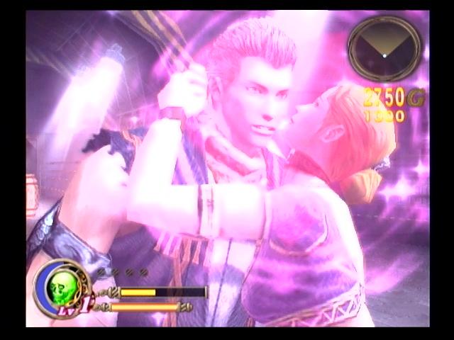 向前走一点会看到对面一位美女正在受到敌人压迫,可没有路过去援救,但这个场景有很多很多箱子,所以不客气地扔过去,对面的敌人是一下解决一个,所以等敌人站住以后再扔,几次以后美女回自己放下掉桥,跑过来送个玩家一记香吻,之后可以去对面把箱子打碎补给一下,回来解决两个看门的MM后来到下一个场景