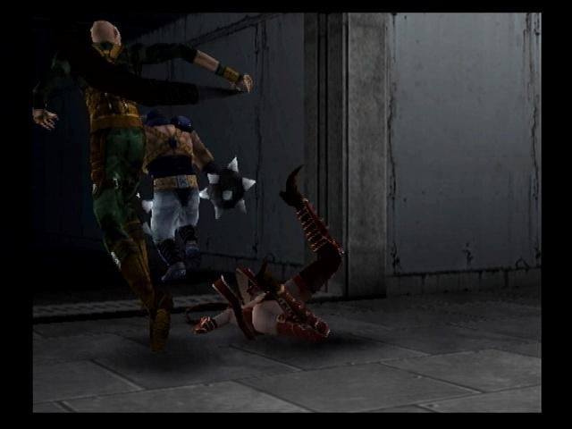 这章的敌人全变成电子人了- -||,建议分开诱敌,先将右边的敌人搞定在引过道口的两个女的,最后两个建议先搞定那铁管的,打倒一个之后回来三个援兵,马上捡起铁管,最好能在窄小的过道和他们打,用铁管△攻击能迅速憋屈死几个敌人,这里很可能会爆出恶魔,不过有铁管在手就不怕什么了,如果铁管用完的话就用飞腿+“灭火”轻松搞定,然后进入对面大门来到下一个场景
