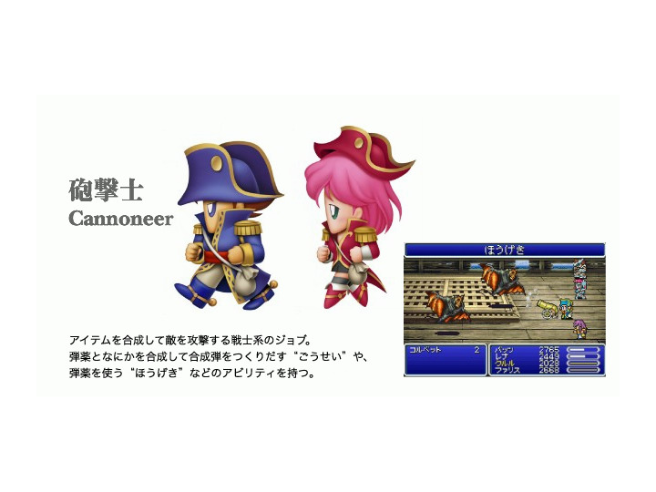《Final Fantasy V Advance》完整移植当年 SFC 版的游戏内容,除了原本就有的数十种丰富职业之外,并加入两种原创新职业「剑斗士」与「炮击士」。剑斗士是精通剑术攻击的战士,特技为全体攻击的「全体斩」以及在队伍后列也能发挥全部攻击力的「后列斩」;炮击士则是具备以弹药来进行攻击之特殊能力的战士系职业,特技为将弹药与道具合成的「合成」,以及使用各种弹药攻击的「炮击」。