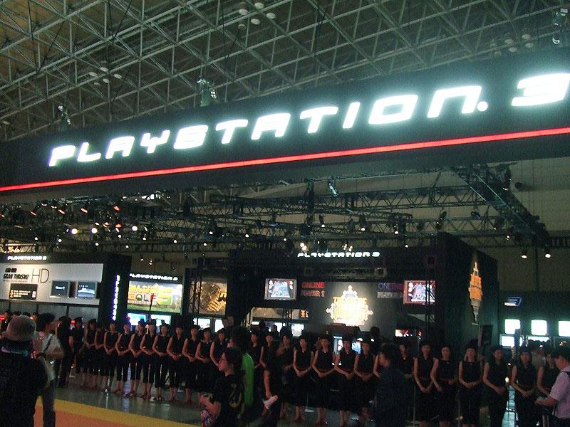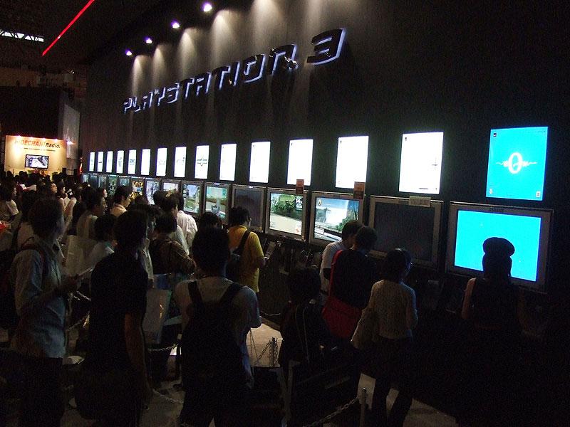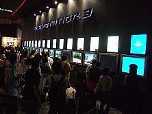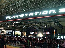 以上游戏试玩台都在展台外侧的右边和展台里面的试玩区里面。而里面的试玩区里玩家不能选择游戏,而是轮到自己顺序的话就到空的机器上试玩,所以里面的试玩台可能就是为了让玩家体验PS3的试玩区。除了这些试玩台以外展台中间还有一面巨大的屏幕,不断地播放PS3游戏影像。