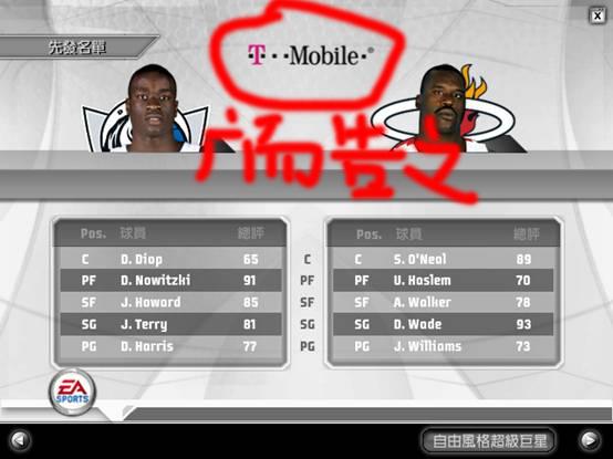 4.在NBA07中,广告也多了,有丰田的皮卡(TOYOTA| moving forward),有T-mobile的手机广告,还有在比赛结束后的当场最佳球员上面的Jordan广告.(见图)