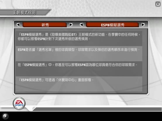 点击王朝模式后,首先跳出来的是关于新一个赛季的选秀工作,EA怕玩家不是很清楚具体操作,给了很详细的说明.