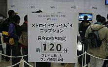 本次体验会的排队情况不像之前的两次体验会那么长,其中还是《塞尔达传说 黄昏公主》的等待时间最常大概是200分钟左右,《勇者斗恶龙神剑 假面女王和镜之塔》和《超级马里奥 宇宙》的等待时间是60分~100分左右,除此之外有一些游戏只要等15分钟左右就可以玩得到,可以比较悠闲地去体验Wii的新作。