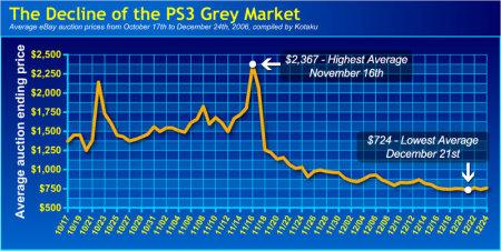 图中表示了就在PS3开卖前的11/16日是为高点2367美金(人民币一万八千多,真疯狂!),正式开卖后就以直线方式降至1000美金左右,而12/21当天达到最低点为724美金,就60G版本的PS3售价为599美金而言,转卖能赚取的价差只剩下125美金。