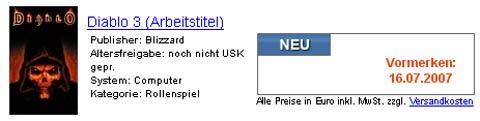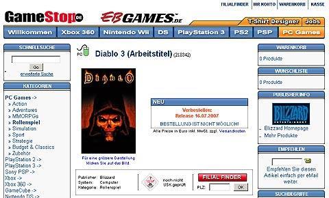 国外媒体从国际知名在线游戏发行商Gamestop网站获悉,《暗黑破坏神3(Diablo3)》已定于2007年7月正式在德国境内销售。但是Gamestop没有公布这款已经为世界玩家期待许久的新作是否仍旧是一款单机RPG游戏,而只是标出“角色扮演(Rollenspiel)”。