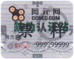 新版本防伪标识采用了人民币防伪技术,在防伪标识中间有个“认”字,不同的角度观看时可由绿色变紫色。标识上方有公司新logo和“网元网”微缩文字的字样,中间有印着“网元网中视网元”浮雕地纹,右侧是防伪团花,下方有9位编号。