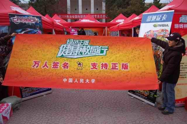 "绿色正版。健康校园行"活动于3月31日在中国人民大学正式启动,也拉开了今年普及正版活动的序幕!本次活动由中国游戏工业委员会和中国版权保护中心联合主办,由网元网(www.ccnec.com)承办,活动除了获得世界知名游戏公司包括EA、UBI、KOEI和宇峻奥汀的共同参与之外,也获得了包括瀚视奇、nVidia、影驰、赛钛客等世界知名硬件厂商的支持。活动将从2007年3月31日起在全国11个城市(北京、沈阳、天津、济南、青岛、上海、南京、武汉、成都、西安、广 州)50所以上的高校展开。