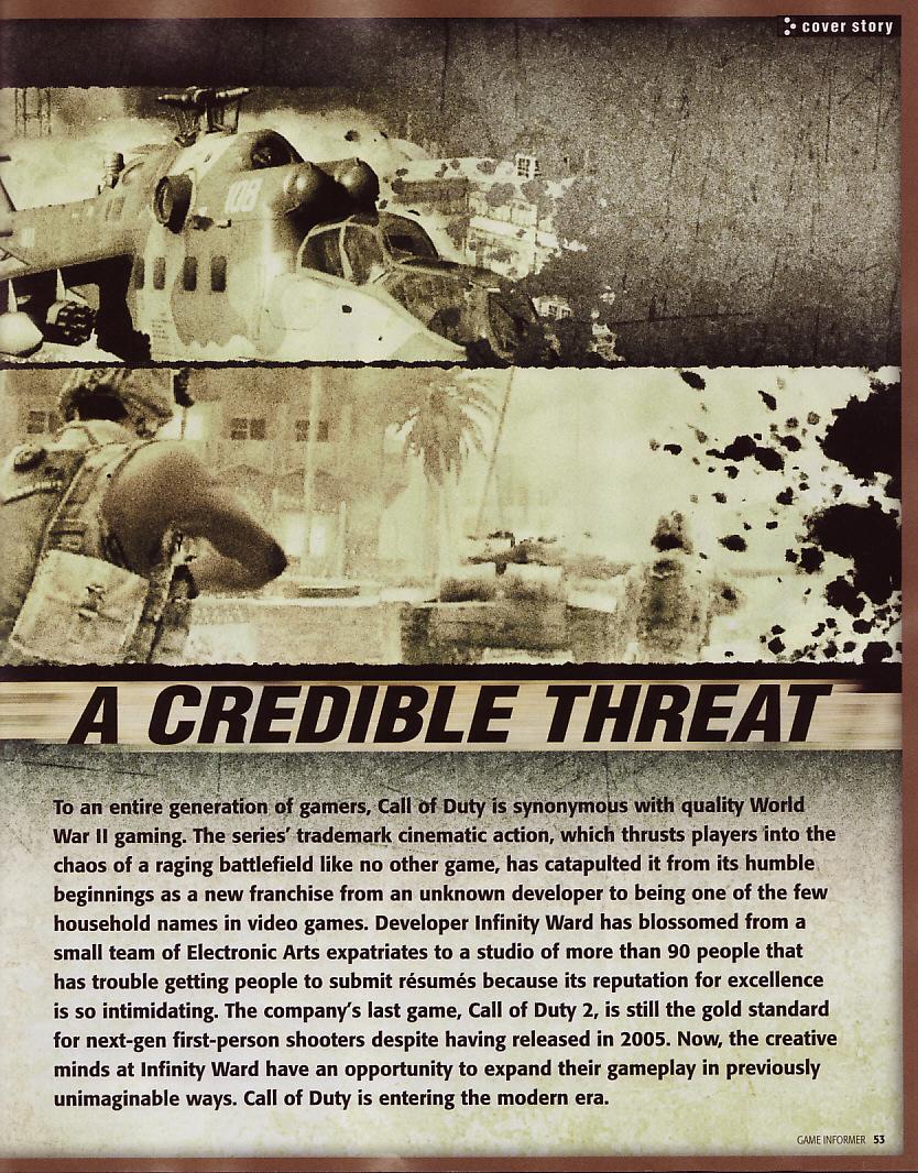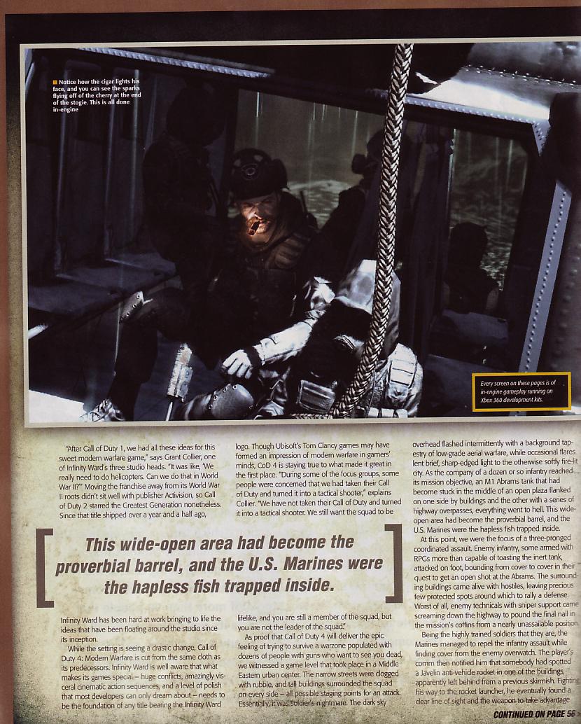 Activision于4月28日正式公布了《使命召唤4 现代战争(Call Of Duty 4: Modern Warfare)》并公开了一段预告片,首次将视野转向现代化战争的《使命召唤》不知道会带来怎样的震撼效果,系列一贯的真实性特点也会带来与其他同类作品有不一样的效果。