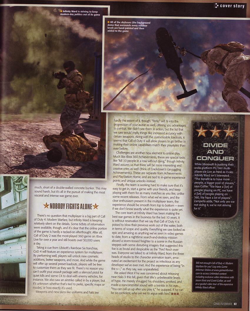Activision于4月28日正式公布了《使命召唤4现代战争(CallOfDuty4:ModernWarfare)》并公开了一段预告片,首次将视野转向现代化战争的《使命召唤》不知道会带来怎样的震撼效果,系列一贯的真实性特点也会带来与其他同类作品有不一样的效果。