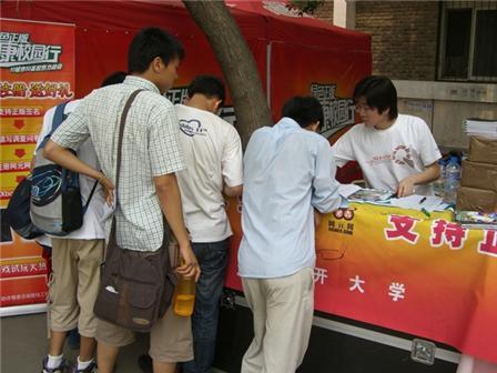 6月8日,校园行活动在南开大学正式展开,活动立刻引起南开学子们的强烈反响。特别是支持正版签名区很快就围上了很多同学,有的签名,有的填写问卷,有的向工作人员询问活动的进展情况。