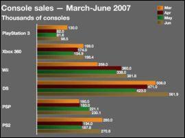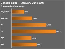 首先第一名的是DS,以二百六十八万的惊人销售排在第一。其次是Wii,巧妙地击败了次世代的每一台主机。PS2的一百五十二万销量是在最初的六个月内被卖出去的,索尼公司需要开始将那些玩PS2游戏者转换成购买PS3的买主。XBOX360真实的成绩,正在不好不坏的买,因为种种设计缺点销售比较不稳定,在接下来的《光环3》上市是否能影响主机的销售就不确定了。