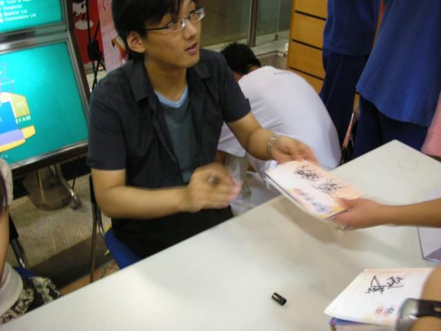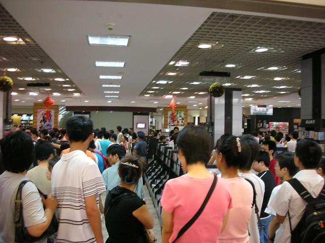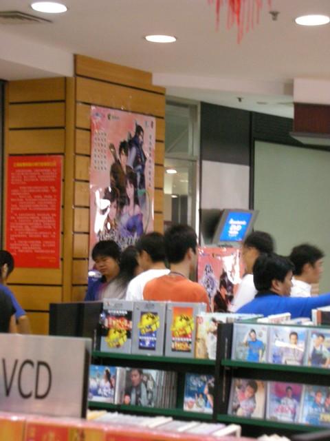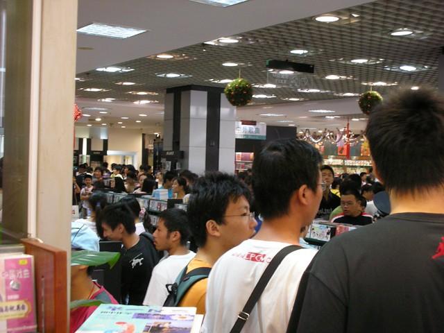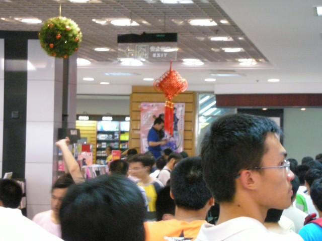 书城的保安因为如此多的人而担忧治安问题,时刻提醒新来的人,“不要签名的跟我走,直接去买带子”。我还是等着,我是为了签名和海报而来的,怎么可能空手而归?况且来都来了,等罢。队伍前面有些人为了方便就放弃了签名,买后扬长而去,但队伍没有因此而缩短,反而更长了,许多人是代别人排队的,通常还会多2-3个人。