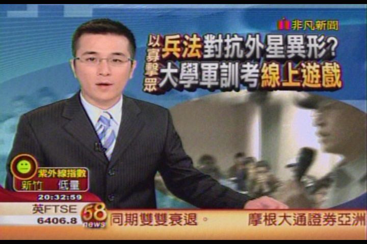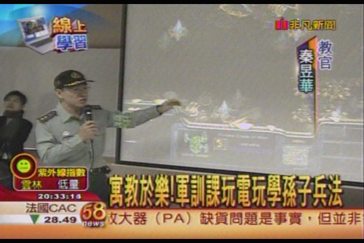 文化大學教官秦昱華,上學年起軍訓課期中考不以傳統方式考試,而要學生在線上遊戲「星海爭霸」中,在神民、地球人、異形三族群之中擇一,在資格賽以一族對抗七族敵人圍攻的預設情境測驗,撐過十分鐘不滅亡,就能拿九十分。
