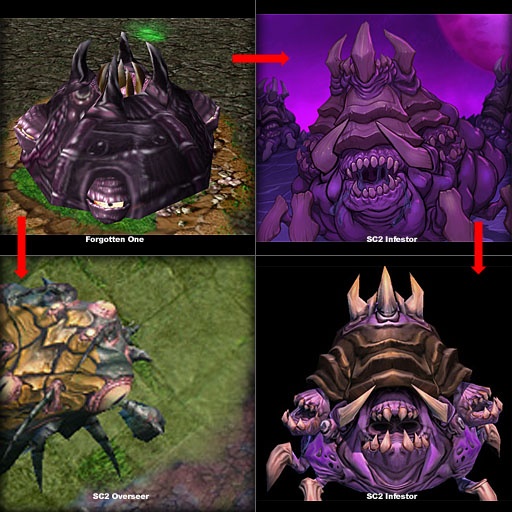 Defiler(玷污者)是虫族战术上强有力的血统,它能轻易的威胁那些最牢固的对手的防御。但是这种生物也是第一个被引进虫族Swarm的种族(所以是Kerrigan最想替换的第一个)在Azeroth上发现的,非常令人恐怖的Forgotten One(被遗忘者)拥有许多还没被利用的隐藏潜质,不只是喷出分非常多的一份份液体的能力。尽管Infester(寄生者)被发现能利用他们的地方很少,被遗忘者各个方向,突起的巨大眼睛能够用来放在Overlord(领主)最近的进化上。Kerrigan的命名Overseer,很明显是参考了被遗忘者相似的特点。Kerrigan决定直接利用这种邪恶生物的吃人外表,从被遗忘者身上,进化她自己创造的儿子寄生者。