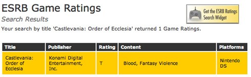 更重要的是,ESRB发布的审核信息中确认了游戏的对应平台就是NDS。如果该情报无误,那么《恶魔城:圣教密令》应该就是继《苍月的十字架》和《废墟肖像》之后NDS上的第3款《恶魔城》系列作品。