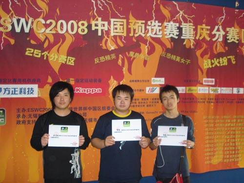 经过3天的激战,ESWC 2008中国区预选赛第二周重庆站比赛率先结束。反恐精英和魔兽争霸3项目的前三名都已经顺利产生,其中两个项目的冠军ASYRIAN EMPIRE战队和WE.TED将直接晋级中国区总决赛,而魔兽争霸3项目的亚军N-Life.3xit.TT及季军tiger.wz则晋级魔兽争霸复活赛。以下是重庆站反恐精英和魔兽争霸3项目获奖名单及获奖选手照片。