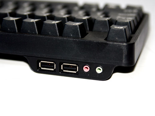 键盘的背面我们并没有发现拖脚的存在,而是完全依靠USB HUB的设计来起到支撑的作用。不知道这样的设计对于键盘喜欢平放的玩家有没有一定的影响。从7G的背部铭牌我们看到,7G来自机械键盘最大的OEM地区**,相信这也使得7G在使用质量了得到了很大的保证。