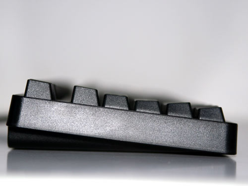 从侧面我们看到,7G的键位采用了人体工学设计,虽然这种设计在键盘行业已经成为标配,但是配合黑轴没有段落的优秀手感,以及黑轴较大的压力克数,却可以给使用者带来长久舒适的使用体验。
