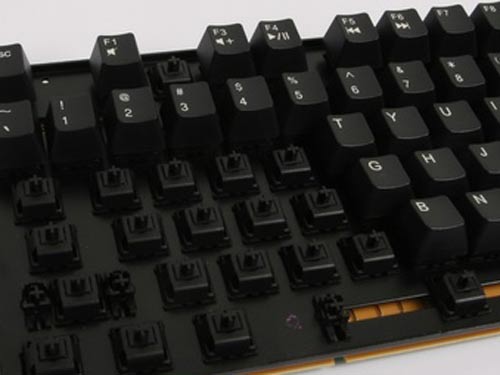 7G的键帽采用同6G2相同工艺的丝网印刷,并在左侧WINDOWS键创新的采用了SteelSeries的新式LOGO的多媒体功能键,同时按下功能键和F1-F6即可激活多媒体键功能。这一设计也使得7G标准的104键设计也变成了优秀的多媒体键盘,玩家在游戏中即可轻松的调节系统音量,同时新颖的LOGO键也为呆板的键盘增添了一丝活力。左侧WINDOWS键的取消彻底明确了7G作为游戏键盘的定位,玩家再也不用担心在游戏中因为误操作按到左侧WINDOWS键而跳出游戏。