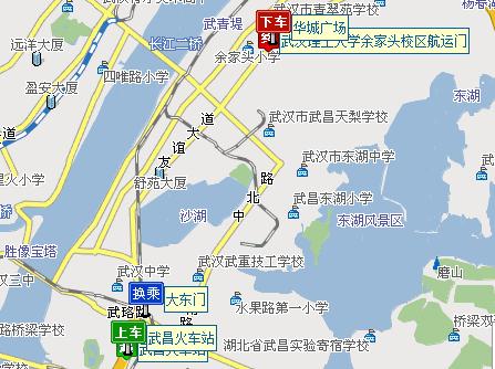 乘577路上行(武昌火车站-岱家山),至徐东村下车,乘540路(鲁磨路-武丰村),至华城广场下车,步行至武汉理工大学余家头校区航运门。