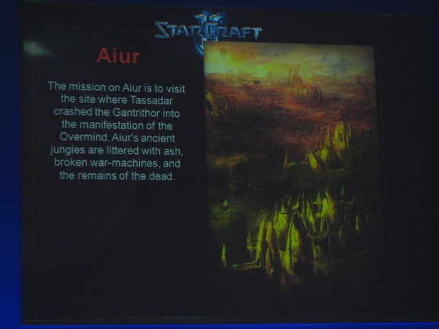 你在Aiur上的任务便是重新造访当年Tassadar驾驶Gantrithor以身殉国、与Overmind同归于尽的地方。Aiur上古老的丛林中四处都是灰烬、战争机器的残骸和残留的尸体。