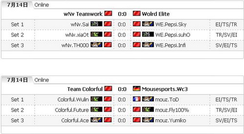 2008年G联赛第一赛季总决赛魔兽项目将由 WE、 wNv、 Colorful和 mouz以双败赛制争夺最后冠军,第一轮对阵如下: