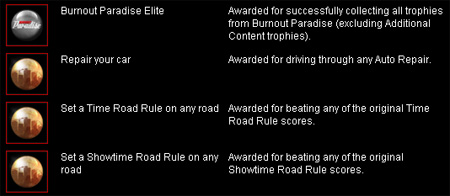 PS3版《火爆狂飙 天堂(Burnout Paradise)》本日再次更新,这一次Criterion Games为强烈呼唤收集成就的PS3玩家送来了新的战利品系统,也就是大家通常说的奖杯。