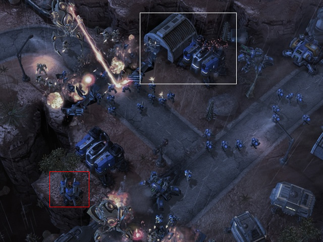 另人担心的是蓝色的单位几乎融入到背景当中,看白框中的车库和兵营, 对于眼神不好的玩家来说,这不是个好消息