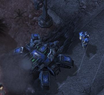 这是一张人族在夜间对抗神族的截图,本图的重点在于图片显示战斗时在夜间进行,同时还有雨天效果,这表明星际2中对环境因素的支持得以加强,只是目前还不是十分清楚类似的环境因素会对游戏产生什么样的影响。