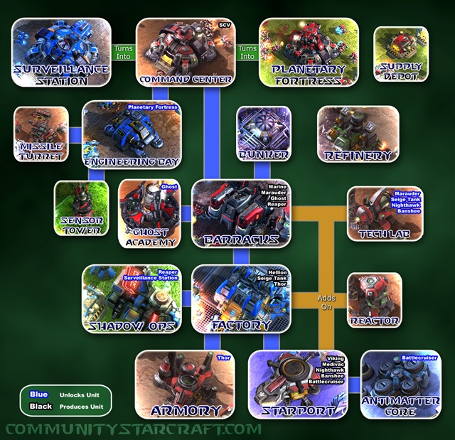 国外网站放出了最新版的星际2科技树,目前只完整列出了人族和神族两个种族的科技树,在科技树中都配上了星际2中个建筑的实物图,同时,各建筑之间的关系也都同时列出,玩家看起来一目了然。小图标右上的字体颜色,蓝色为科技建筑可解锁单位,黑色为出兵建筑可生产单位。