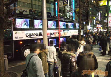 这辆宣传大巴最初停靠在了电器街的虎之穴本店与Taito街机厅之间的路口处,正是人潮汹涌的繁华地段,因此引来了相当数量的路人围观,虽然很多人表示并不喜欢这种宣传手法,但也还是照样举着相机和手机一通狂拍。