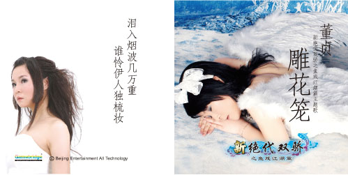 北京娱乐通投资研制的动作角色扮演游戏《新绝代双骄之鱼戏江湖篇》邀请了著名的游戏音乐制作人晓旭游戏音乐工作室担任游戏音乐和游戏歌曲。游戏主题歌“雕花笼”由歌手青年女歌手董贞演唱。