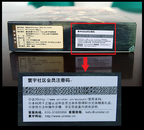 《三国群英传Ⅶ》、《汉之云》包装底部有一张长方形白底黑字的防伪标识,这就是“寰宇社区会员注册码”的所在位置,刮开“银黑色部位”就可以得到一组号码,进入寰宇之星会员中心(http://www.unistar.cn/account)验证就可辨别真伪。