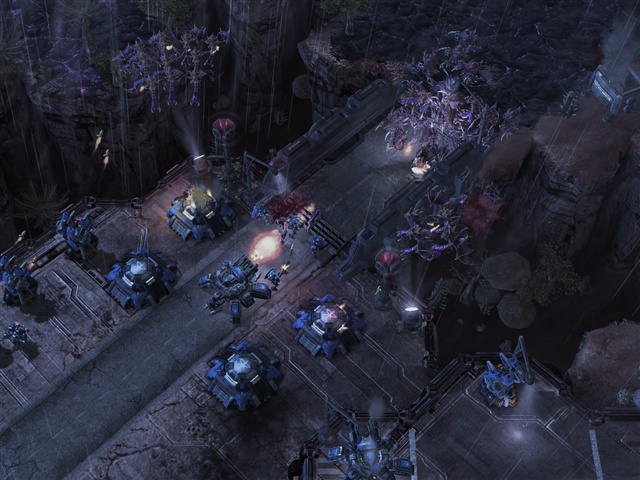 星际争霸2官方网站更新了一张原画和四张截图。这张原画我们在昨天已经看过,是关于新老暗黑圣堂武士的对比。而更新的四张游戏截图又为我们带来一些新的东西,雷神升级了武器后的样子,战列巡洋舰升级不同技能后的情况等等。 虫族的刺蛇海进攻神族的基地,面多如此大量的小狗和刺蛇,神族纵