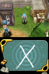 这本作游戏世界中的魔法,是通过名为“マホイタ”的小型黑板来描绘发动的。玩家通过触摸屏画出魔法阵,在限定时间内完成即可发动。
