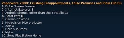 恐怕大家听到暴雪说“《星际争霸2》在该完成的时候就会完成”,都会有一些感想吧,还有听到《星际争霸2》战役被肢解为三部曲……国外有个网站就搞了个“2008年度最能跳票软件排行榜”,注意,这是跳票软件排行榜,还不是跳票游戏排行榜,连IE8这样的东西也有,可是《星际争霸2》还