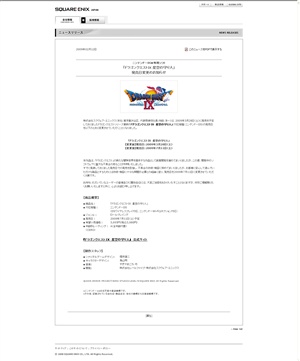SQUAREENIX公司本日2月12日宣布,原预定于2009年3月28日发售的NDS新作《勇者斗恶龙IX天空的守望者》将延期至2009年7月11日发售。 此次《勇者斗恶龙IX天空的守望者》延期是由于“游戏在开发中发现存在重大问题”。官方新闻稿(原稿删除后更换了新链接地址)