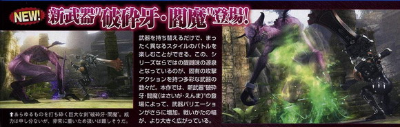 隼龙新武器“破碎牙·阎魔”:能将所有物体打碎的巨剑,威力巨大,挥动速度会比较缓慢。小编语:从描述来看,应该是忍龙一代的大刀回归,洒花吧。