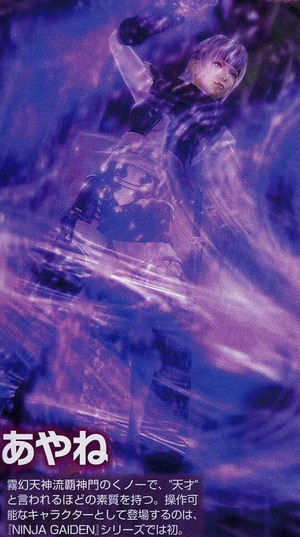 一直作为忍龙系列剧情重要任务的女忍者绫音(AYANE)首次作为可用角色登场,据悉是应广大Fans的要求特别加入的。绫音作为"雾幻天神流霸神门"的女忍。14岁便拥有被称之为天才的素质。在前《忍者龙剑传》1代"隼之里"被袭击后,被隼龙救回。在本作中绫音将使用双手小太刀,攻击凌厉迅猛,面对远距离的敌人也可用使用爆破镖来进行攻击。