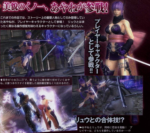绫音的服装继续走性感路线,也继承了TECMO的传统XD,标志性的紫色性感劲装,身背一个夸张的大蝴蝶结,操作的感觉将会和隼龙完全不同。另外还公布了绫音和隼龙的合体攻击技,同时发动忍法?