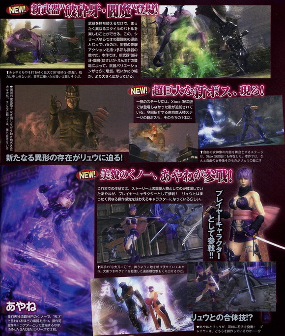 巨型新boss登场,在本作的部分章节中,追加了X360版中没有出现的巨型boss,本次杂志图中公布了东京摩天大楼章节中的巨型佛像boss,甚至连美国自由神像都成为新boss?小编语:巨型boss战,忍龙要向战神发展?